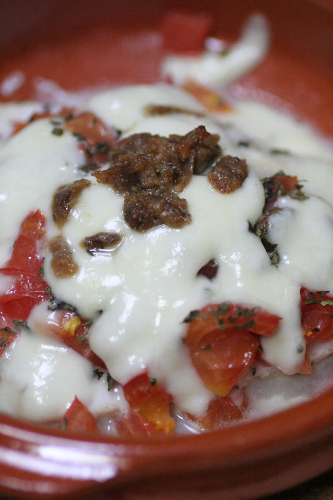 メカジキの上にトマト、モッツァレラ、アンチョビをのせてオーブン焼きにします。とてもおいしいので何度か作っていますが、焼いているときに水が出てしまうのが課題です。次回は、生メカジキを使うか、軽くソテーしてから作ってみようと思います。