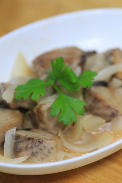 小麦粉をつけて焼いたカツオに、甘酸っぱいマリネ液(+炒め玉ねぎ)を加えたものです。さっぱりしていておいしいです。